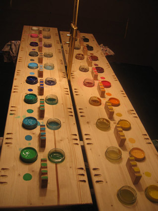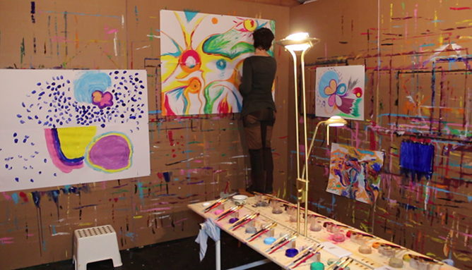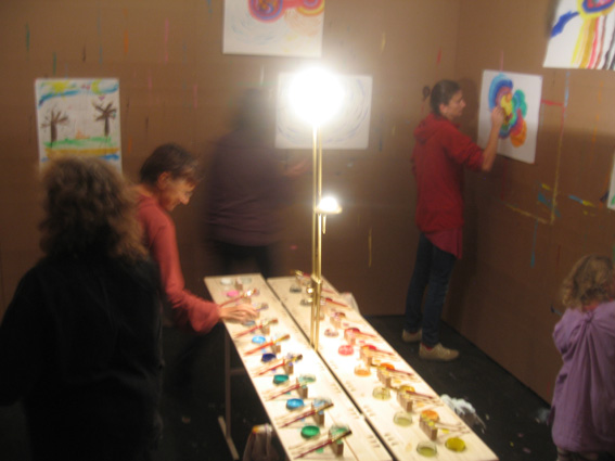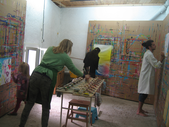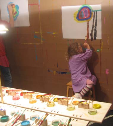 les murs sont tapissés de papier craft sur lequel on met de grandes feuilles de papier à l'aide de punaises et l'on peint avec de la gouache. Au milieu de la pièce se trouve une grande table avec 18 pots de couleurs differentes et de plusieurs pinceaux par couleur.